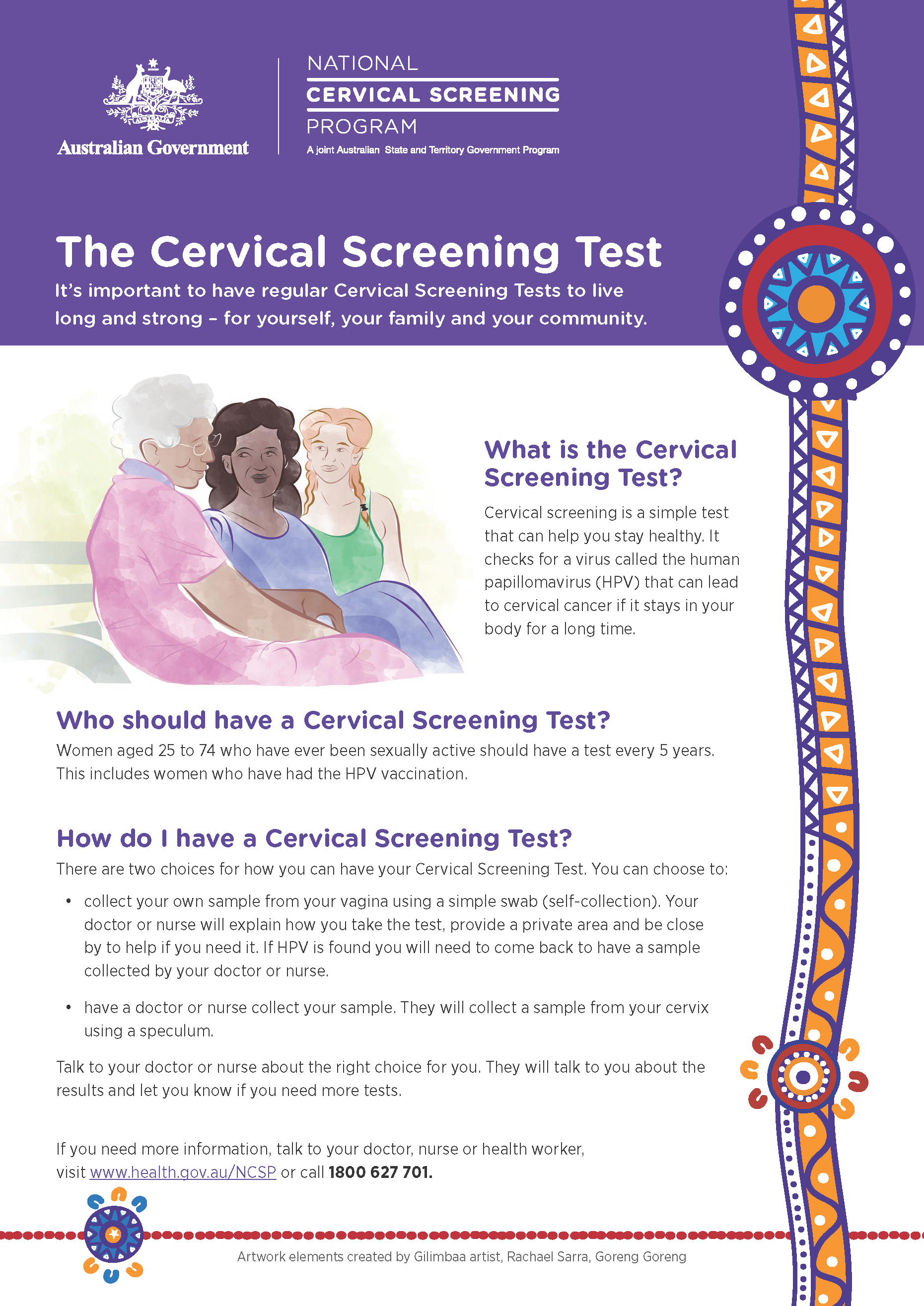 REsources Community Instructions of how to take cervical screening test [video]How to collect your own sampleThe Cervical Screening TestUnderstanding your test resultsOur Mob and CancerCervical screening for Aboriginal womenVACCHO Women’s Business Booklet Clinicians Cervical Screening PathwayHow to increase screening in your local areaEducation for PractitionersClinical GuidelinesNational Cervical Screening ProgramNational Cervical Screening RegistryNational Strategy for the Elimination of Cervical CancerWHO Cervical Cancer Elimination Initiative Researchers 2021 C4 CRE Elimination Progress Report2022 C4 CRE Elimination Progress Report Partners C4 — Cervical cancer control TACTICS — Centre for Research Excellence